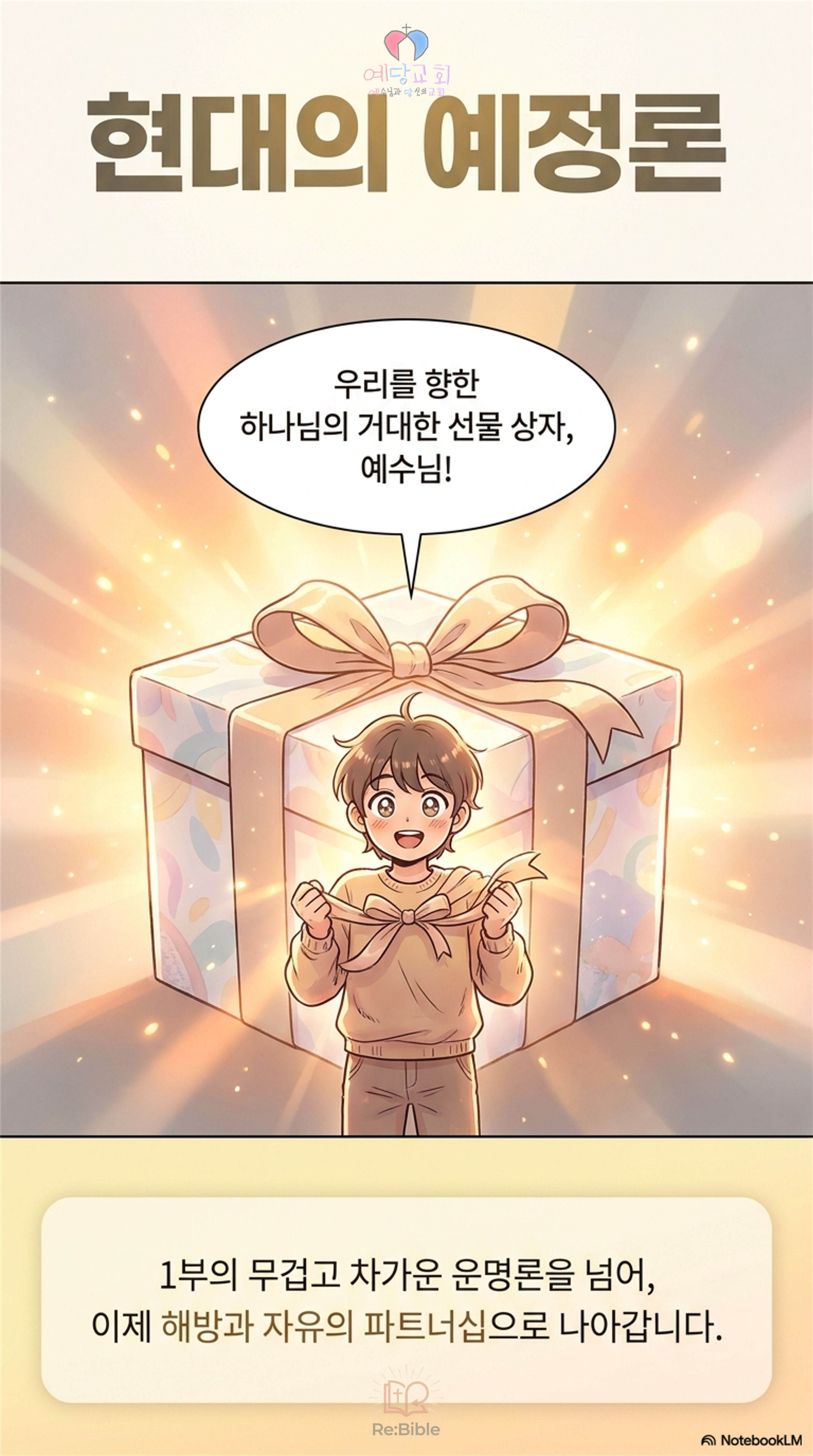 하나님께서 세상을 만드실 때 가장 먼저 계획(예정)하신 것은 우리 개개인의 운명이 아니라, 바로 독생자 예수님이셨다는 것입니다. 그리고 그 예수님 안에서 우리 인류 전체를 사랑하기로 이미 결정하셨습니다. 즉, 예정론은 ‘심판의 대상 명단’이 아니라 우리를 향한 ‘하나님의 거대한 초대장’이 된 셈입니다.