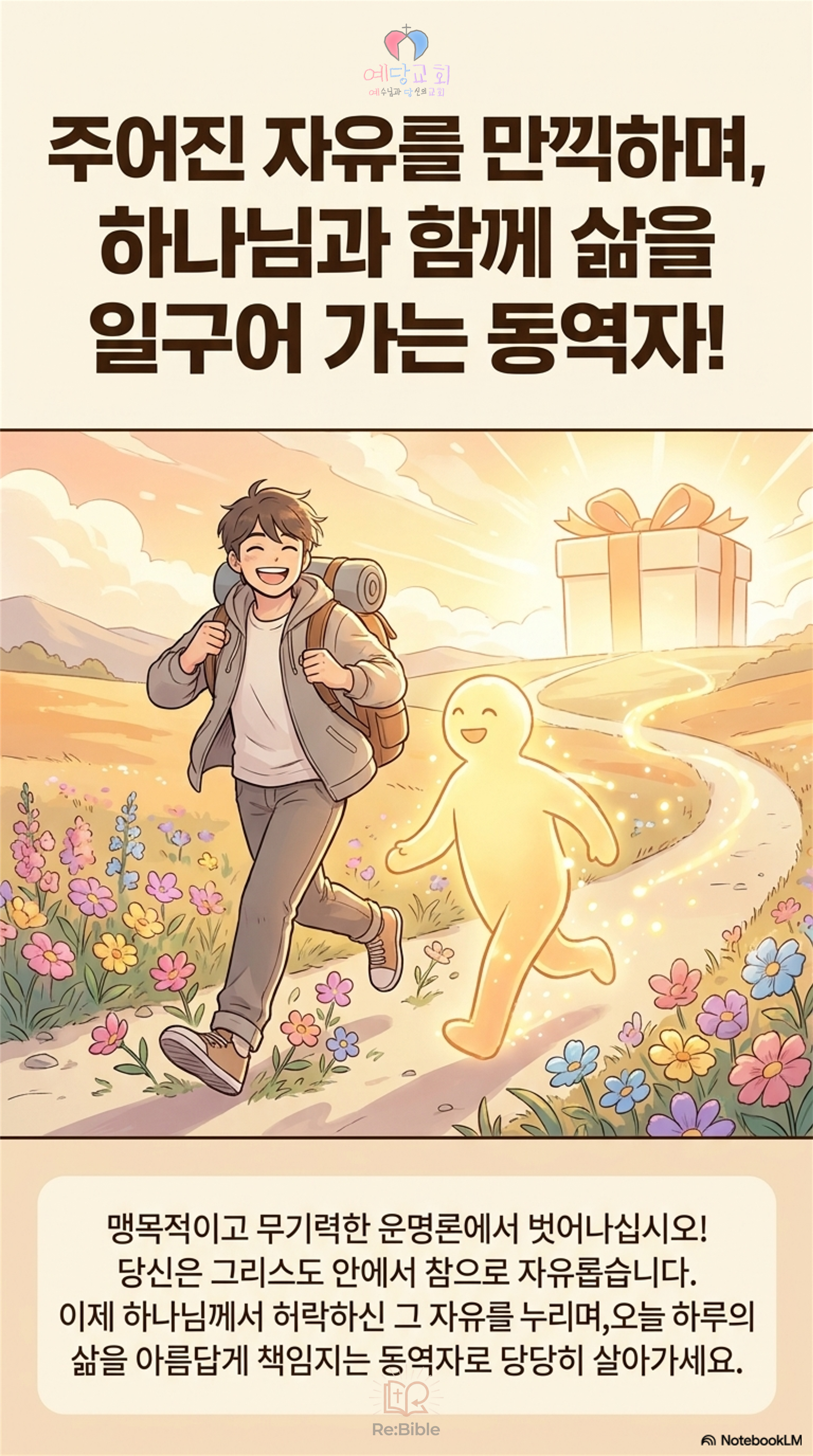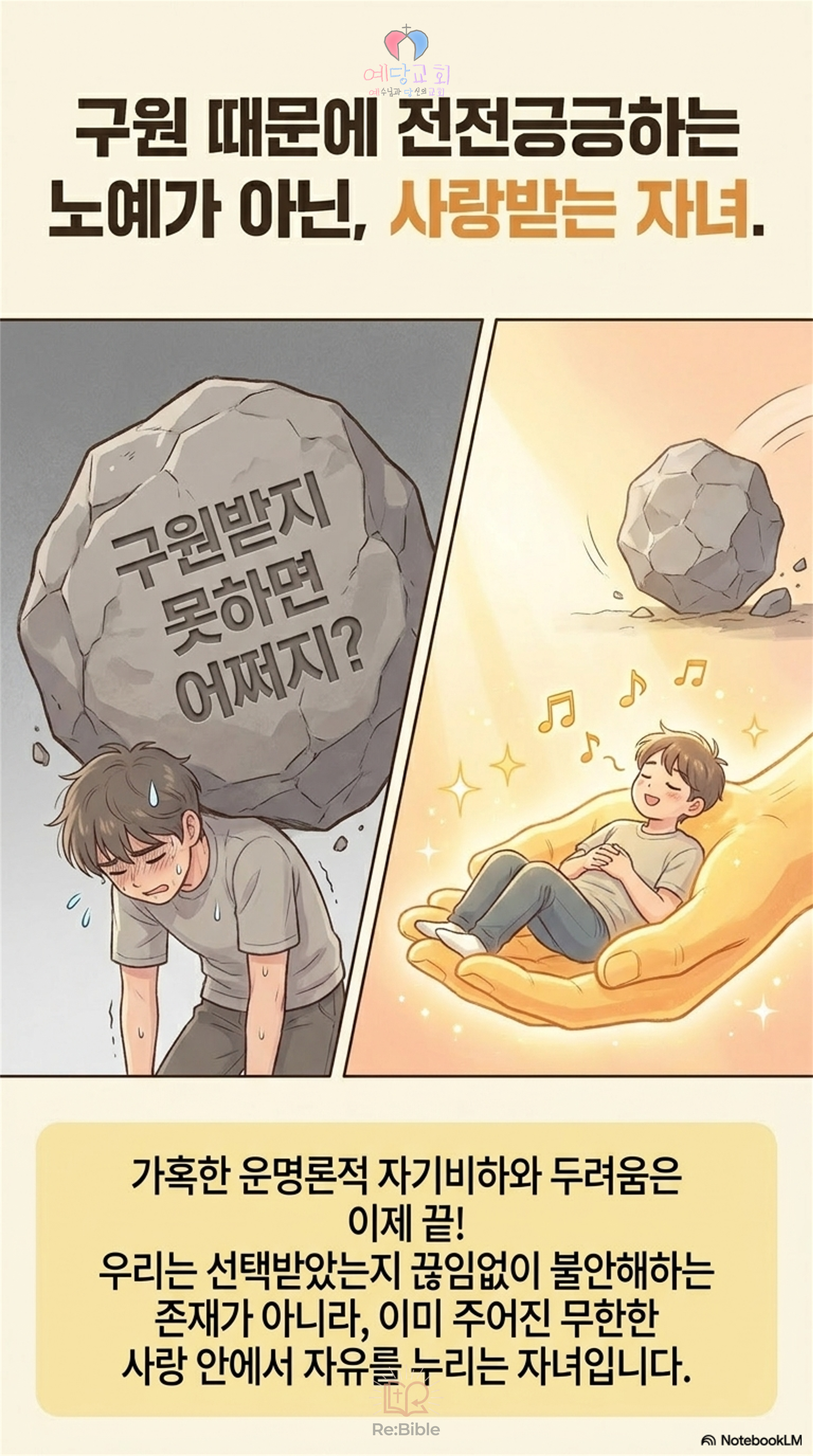 이제 우리는 “내가 구원받았을까?”라는 불안함에서 벗어나도 좋습니다. 우리는 이미 그리스도이신 예수님을 선물로 받은 엄청나게 존귀한 존재들입니다. 그저 감사함으로 우리에게 주어진 자유를 만끽하며 하나님과 함께 내 삶을 누리며 일구어가면 될 뿐입니다.