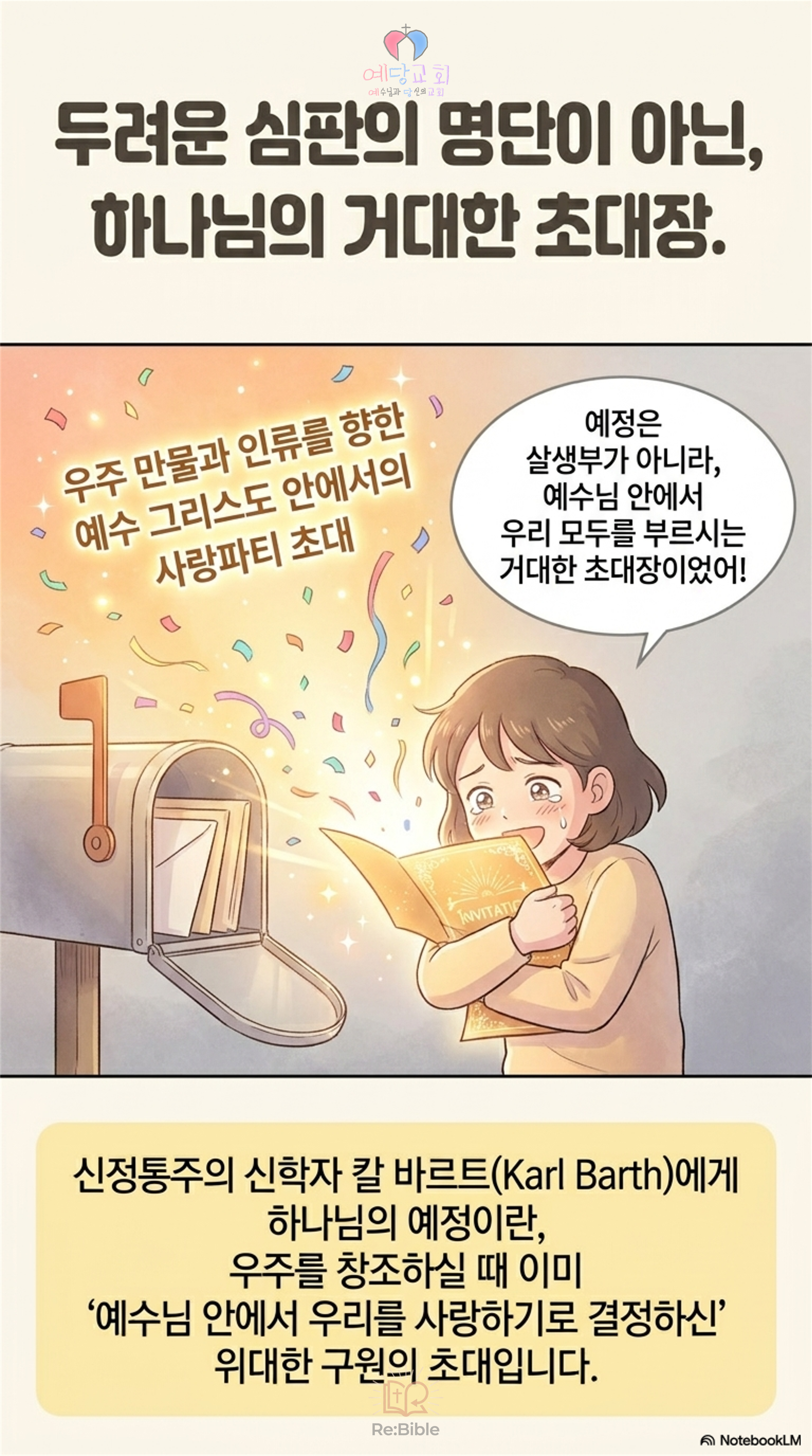 바르트의 이런 생각은 우리에게 놀라운 위로를 줍니다. 우리가 이 땅에 태어났다는 사실 자체가 이미 예수님을 통한 하나님의 사랑과 구원 계획 안에 들어와 있다는 뜻이기 때문입니다.