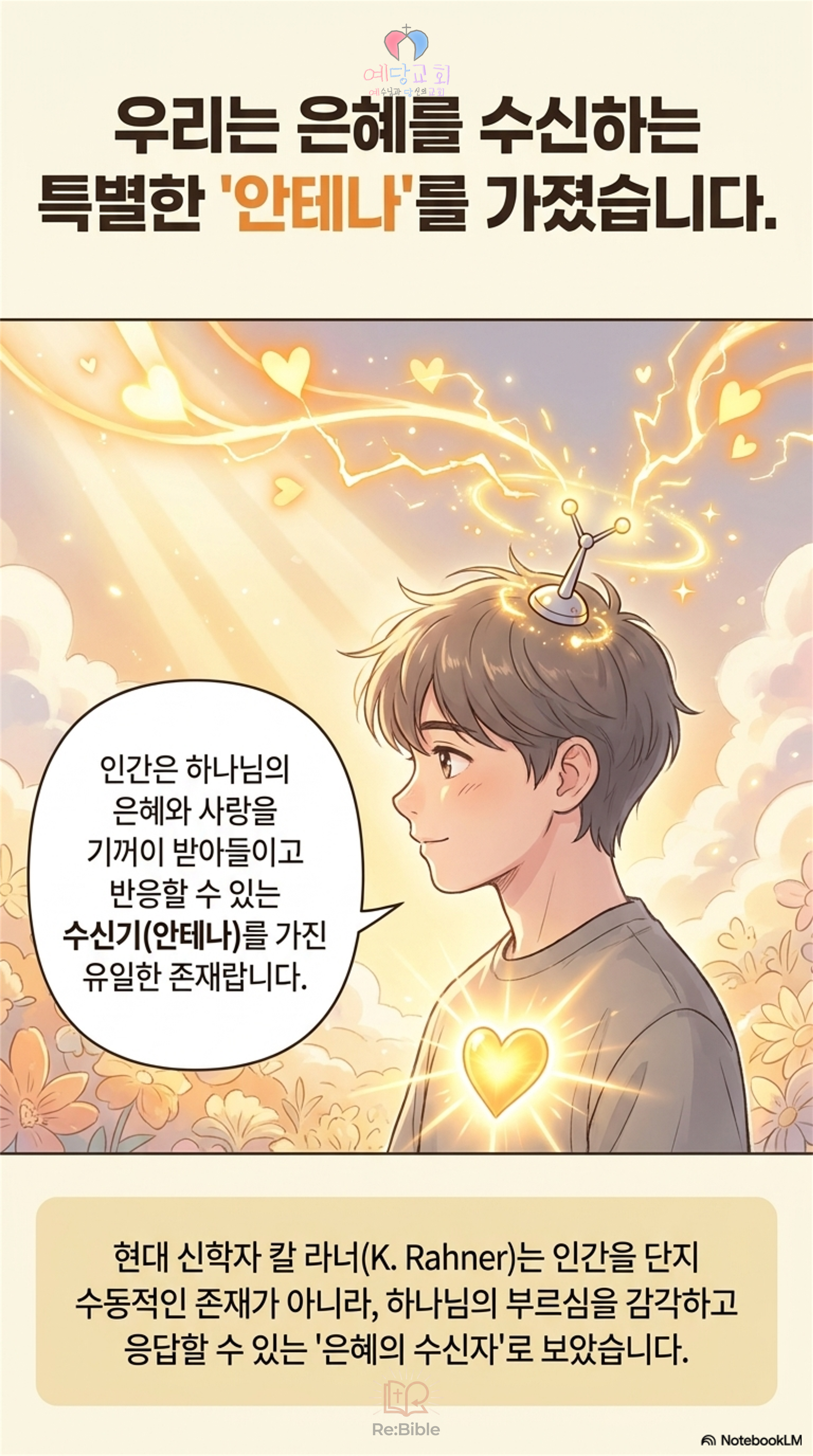 신학자 칼 라너 역시 인간은 태어날 때부터 하나님의 은혜를 받아들일 수 있는 ‘안테나’를 가지고 태어난다고 보았습니다. 우리는 더 이상 구원받기 위해 전전긍긍하는 존재가 아닙니다. 오히려 하나님의 사랑 안에서 이미 선택받은 존재로, 그 사랑에 주체적, 인격적으로 응답하는 자녀들인 것입니다.