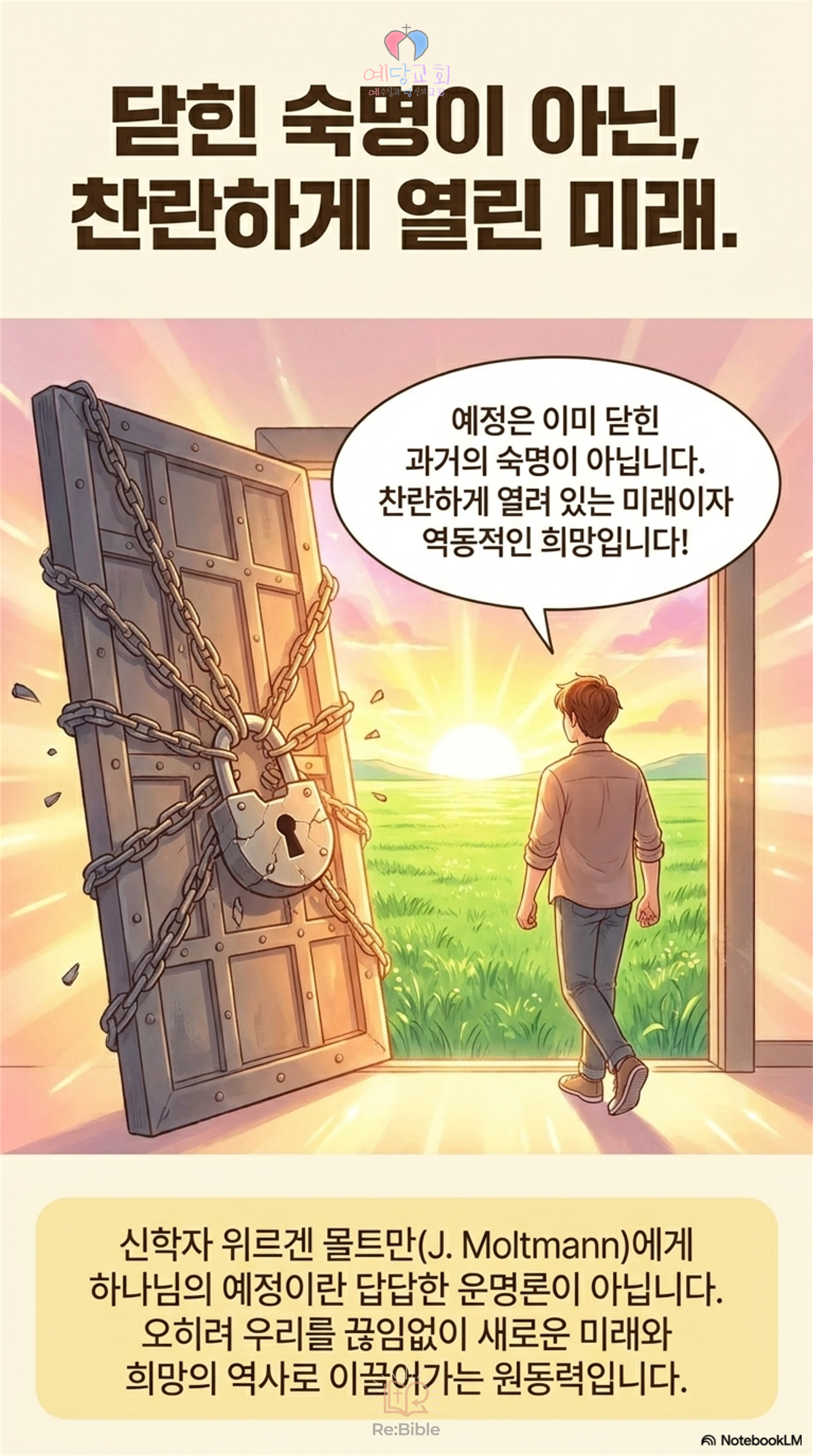 예정의 현대적 이해는 결코 “모든 것은 이미 다 정해져 있다”고 말하지 않습니다. 오히려 몰트만 같은 신학자들은 예정론을 통해 ‘희망’을 이야기합니다. 인격적인 하나님께서 우리를 예수 그리스도 안에서 자유를 누릴 자녀로 “이미” 예정하셨기 때문입니다. 예정은 과거의 결정이 아니라, 오히려 예수 그리스도 안에서 펼쳐질 미래의 희망입니다.